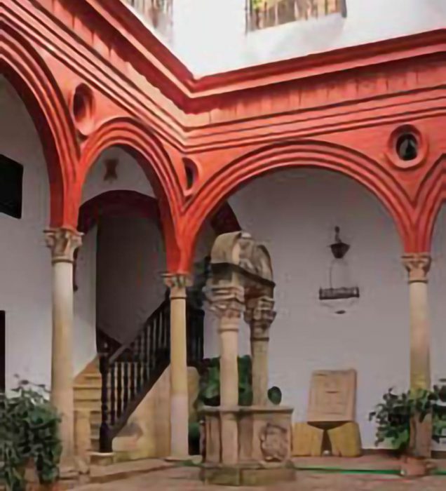 De gran belleza es el patio más cercano a la cornisa del tajo por el que se accede al jardín. Es un patio mudéjar, muy original con triple arquería baja en tres de sus lados, constituida por arcos de medio punto primorosamente aparejados en ladrillo raspado sobre columnas de mármol con base, capitel y ábaco.