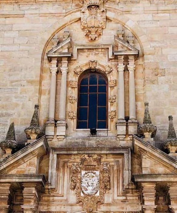 Posee una puerta central de una gran belleza y valor artístico. Con un arco de medio punto enmarcado por columnas toscanas que sostienen un frontón partido rematado por pirámides y bolas. En el tímpano aparece un medallón con la representación de la santísima Trinidad y un grupo escultórico en el que figuraba un ángel enarbolando cadenas, flanqueados por dos personajes en posición orante, que rememora la visión milagrosa que tuvo el fundador de la Orden San Juan de la Mata. Este ángel debido a su deterioro fue sustituido por una cruz latina de piedra a mediados del XIX. Tiene un segundo cuerpo con columnas toscanas pareadas, y un tercer cuerpo, más pequeño, remata la fachada con un frontón curvo partido, con un balcón en el tímpano con el escudo papal coronado por una cruz.